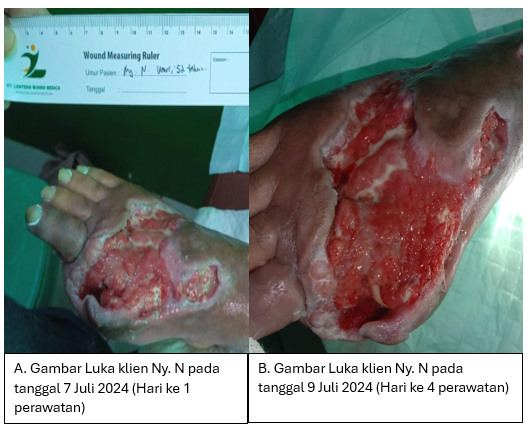 Implementasi pada hari pertama (Minggu 07 Juli 2024 jam 13:00) didapatkan sebelum tindakan perawatan luka, tampak balutan kaki klien sudah basah, berwarna kuning dan berbau khas. Perawatan luka dilakukan dengan cara: menempatkan pasien dengan posisi nyaman dan lukannya dapat terlihat dengan baik, memasang perlak di bawah kaki klien, membasahi balutan dengan NaCl, membuka balutan kaki klien secara perlahan, observasi luas, kedalaman, cairan dan yang lainnya, luka klien dicuci menggunakan sabun luka pada daerah sekitar luka dengan menggunakan kasa, mencuci bagian dalam luka dengan tidak melakukan penekanan pada luka, dan dibilas menggunakan wound irrigation solution. setelas selesai pembilasan, dilakukan penekanan pada area di sekitar luka untuk mengeluarkan eskudat, kemudian dibilas kembali dengan menggunakan wound irrigation solution. Luka yang sudah dibersihkan diolesi salep Metcovazin dengan ketebalan oles sekitar 2 mm dan dibalut dengan dressing foam sesuai ukuran luka, dan dibalut dengan kassa steril dan kassa gulung dan pada balutan terakhir menggunakan greb bandage.