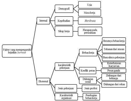 Maslach membagi faktor yang mempengaruhi kejadian burnout menjadi dua faktor, yaitu faktor individual (internal) yang terdiri demografi, kepribadian dan sikap kerja, serta faktor situasional (eksternal) yang terdiri dari karakteristik pekerjaan, jenis pekerjaan dan karakteristik organisasi (4). Maslach telah mengembangkan instrumen untuk mengukur tingkat burnout yang disebut dengan MBI, MBI awalnya dikembangkan pada akhir tahun 1970, versi pertama MBI dikembangkan untuk orang-orang yang bekerja dalam pelayanan kemanusiaan yang juga diketahui sebagai MBI-HSS (MBI-Human Service Survey) (8). Dalam MBI-HSS terdapat 22 pertanyaan yang dibagi kedalam 3 dimensi burnout yaitu, 9 pertanyaan untuk dimensi emotional exhaustion, 5 pertanyaan untuk dimensi depersonalization dan 8 pertanyaan untuk dimensi personal accomplishment (9).